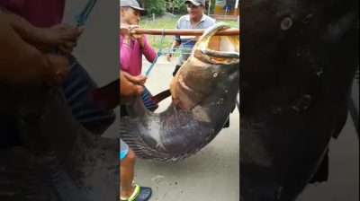 Fishermen somewhere in South America carry in their car a huge goliath grouper.