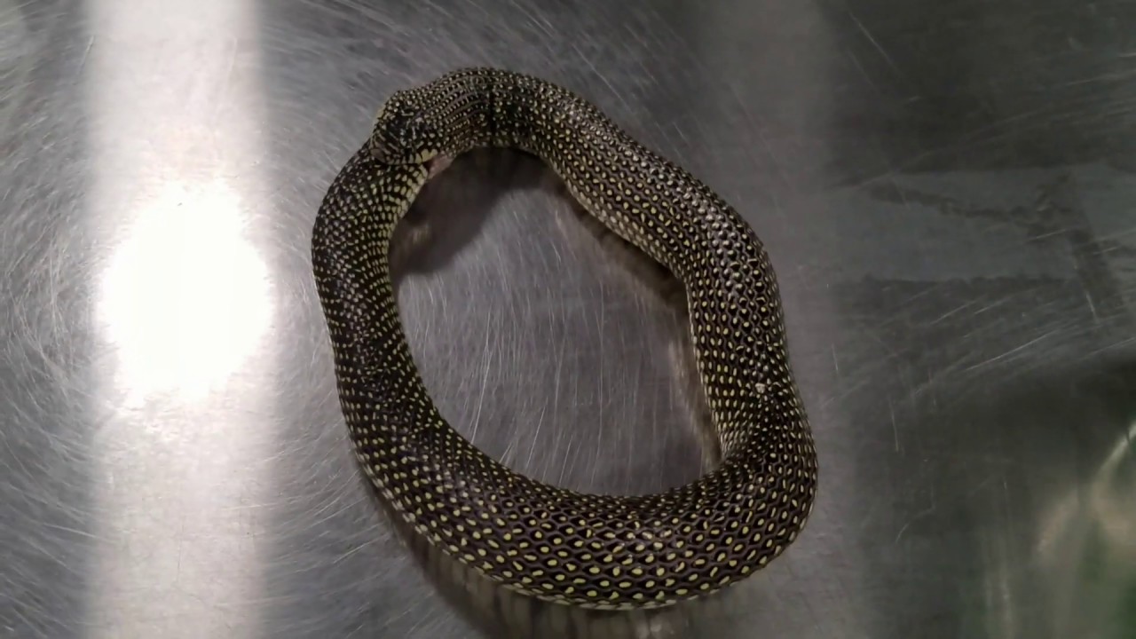 A royal snake (Lampropeltis holbrooki) in the United States Texas tries to eat its tail, thinking that this is another snake. Royal snakes in nature, others eat them like. Alcohol irritates snakes, so here hand antiseptic was used to make this snake to pull its tail by mouth.