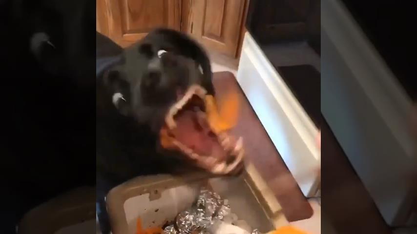 A dog makes a great effort to catch and eat the peel of a carrot to clean the garbage of the kitchen.