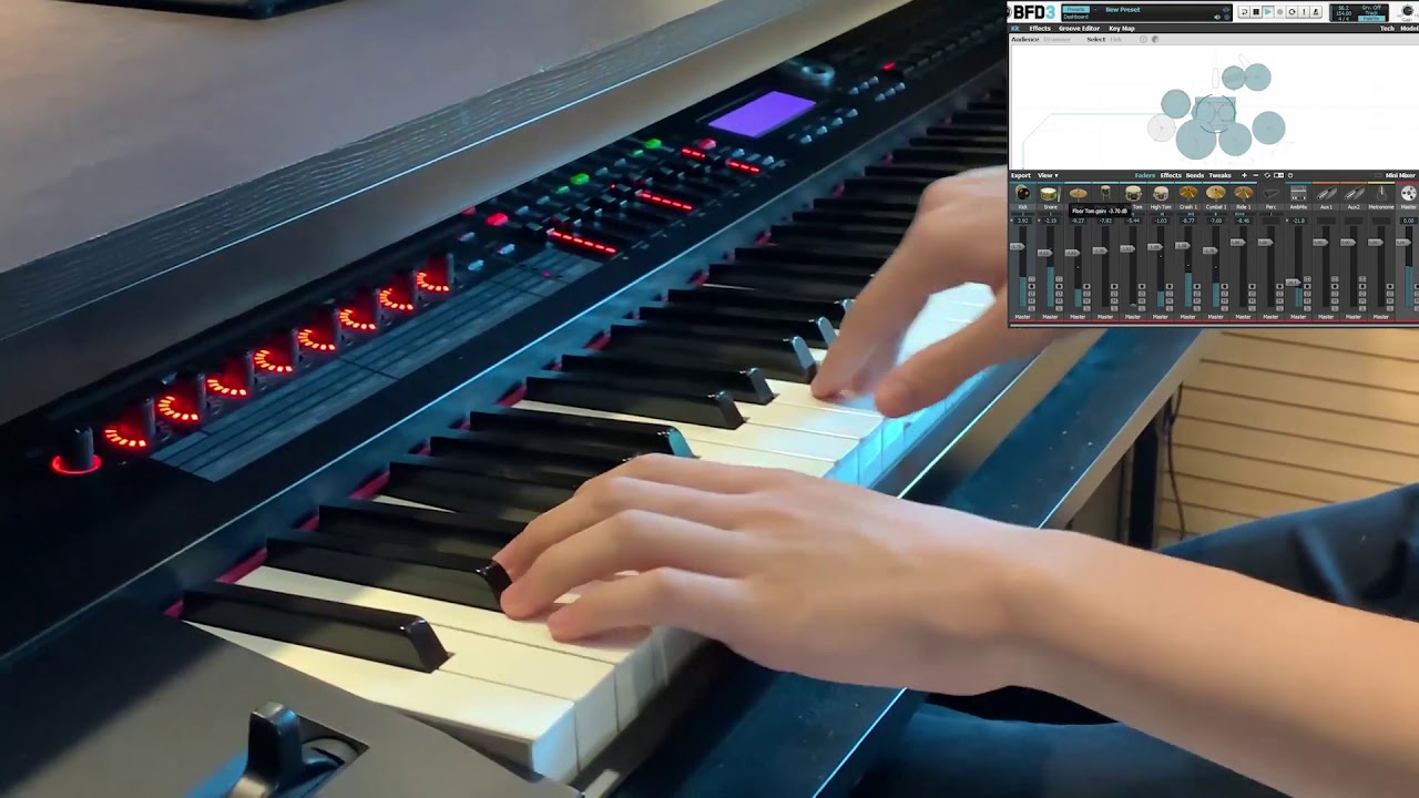 Pianist Yohan Kim from Korea plays drums in a synthesizer, with the keys corresponding to each of a percussion drum set.