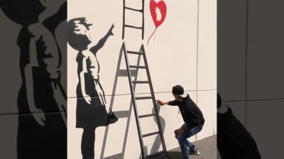 Zach King escapes a guard catching him do graffiti, reproducing Banksy's “Girl with Balloon” on the wall of a building.