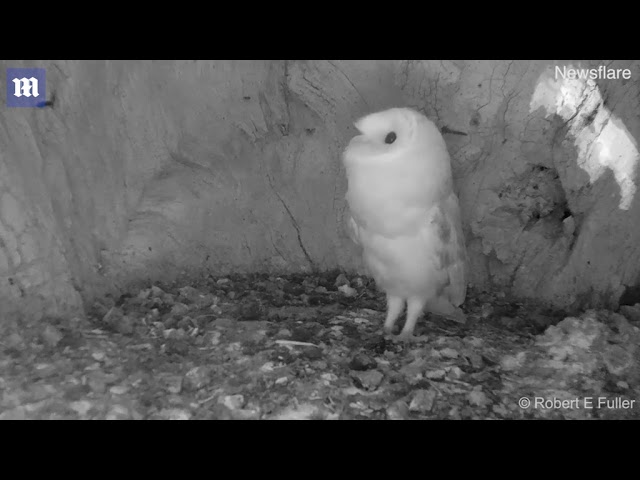 During a stormy night in North Yorkshire, England, British Wildlife Filmmaker Robert E Fuller recorded the reaction of an owl Barn Owl in a tree trunk. Faced with intense light and powerful sound of lightning, the frightened bird begins to decline to resort to the back of the nest.