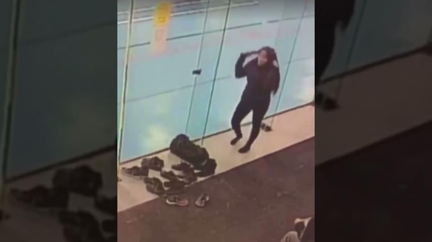 A girl trying to get into a school gymnasium surrounded by glass. Will hit three times head of the glass, until finally find the entrance to the fourth attempt.