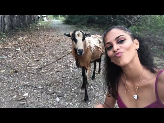 A woman wants to pull a self with a goat is tied with a rope. This is not like much the goat, which then will attack.