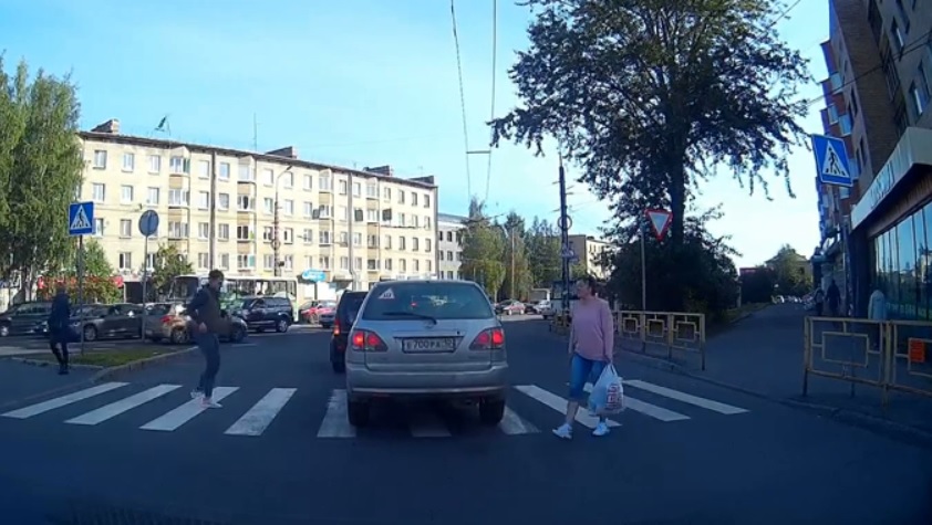 On August 9, 2019 in the city of Petrozavodsk Russia, a pedestrian crossing the road will pass through a vehicle that has stopped on the walkway.