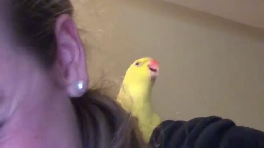 A parrot sings and shakes his head rhythmically, accompanying its owner's.