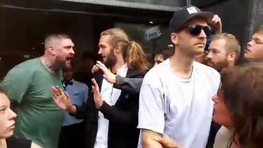 During activists protest against meat consumption in Denmark, a group of people standing in front of the door of a Restaurant McDonalds blocking the entrance. But a hungry man will pass pushing. He will then insult them by saying “Fuck you hippies”.
