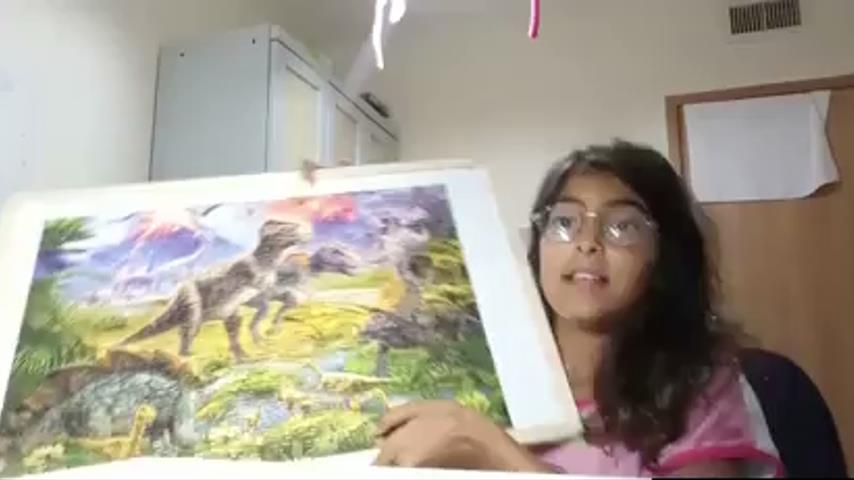 A girl shows just completed puzzle