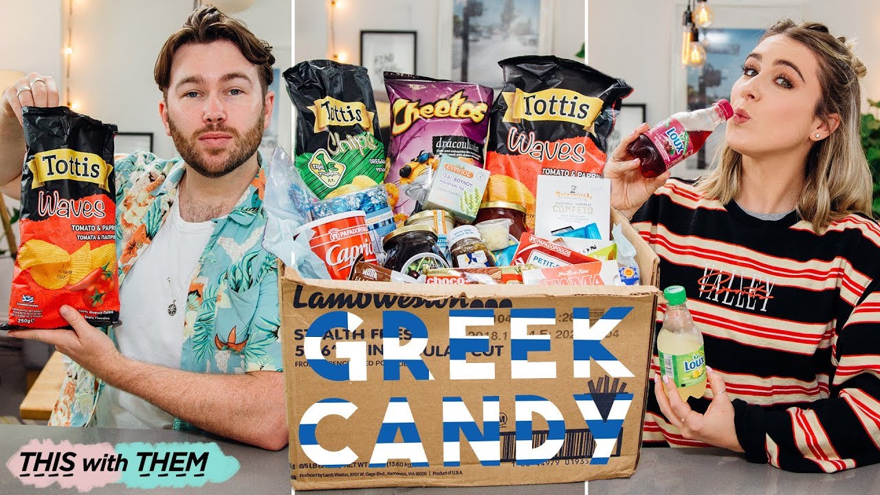 Kate and Alex from the channel 'This With Them' try a box of Greek sweets, beverages and other edible products.