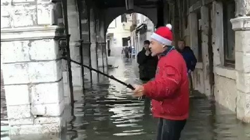 During Acqua alta in Venice, a man dressed as Santa Claus is trying to pull a selfie on flooded roads. Walking in the water looking at his phone, and will not notice that approaching a channel.