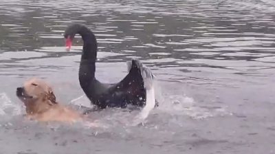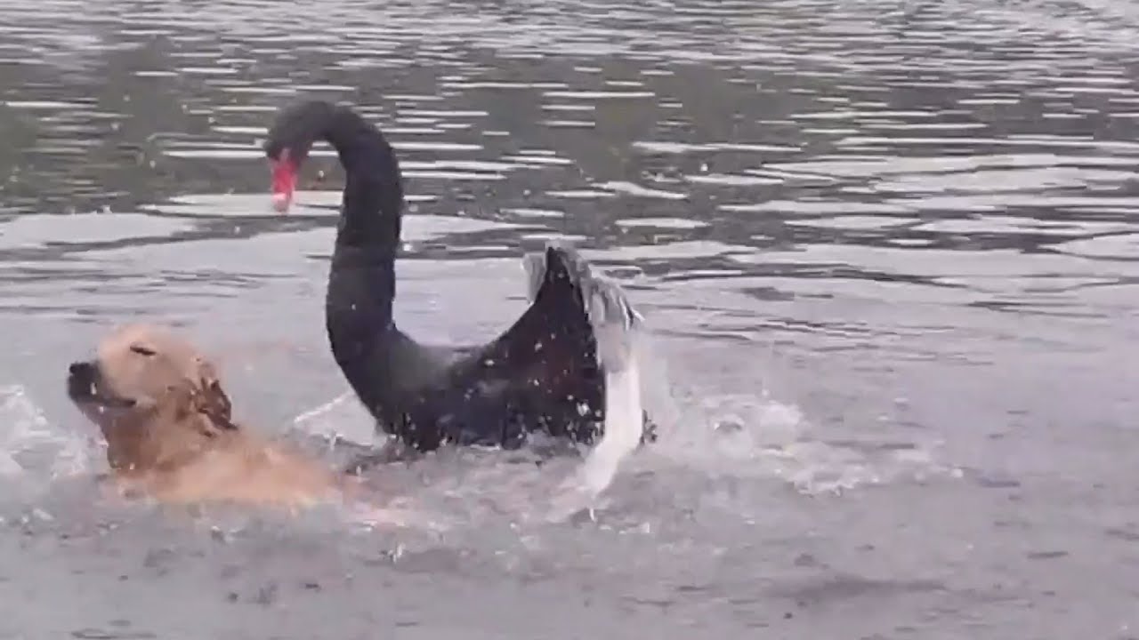 A golden retriever is attacked by a black swan while swimming on the surface of a pond in Chengdu China.