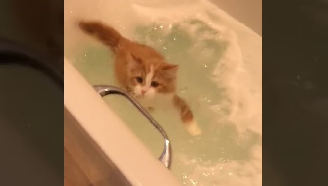 A kitten in England Manchester has the curiosity to touch soapy water of the tub.