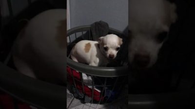 A puppy is hidden in a basket of laundry, but its tail will reveal the hiding place.