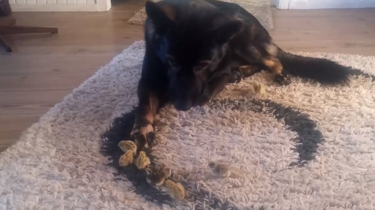 Two German shepherd, by Thorin and Charon, meets first metrically newborn chickens.
