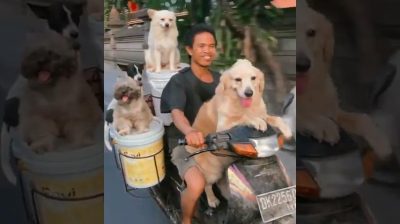A Vietnamese leads a group motorcycle with 5 buckets paint and 6 dogs of.