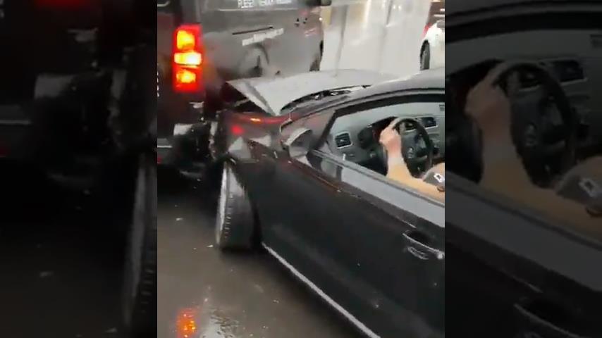 In a street in Austria, a driver collides with a van but does not want to wait for the police and trying to leave the point. But having started with almost damaged her car, will collide with another vehicle waiting at traffic lights.
