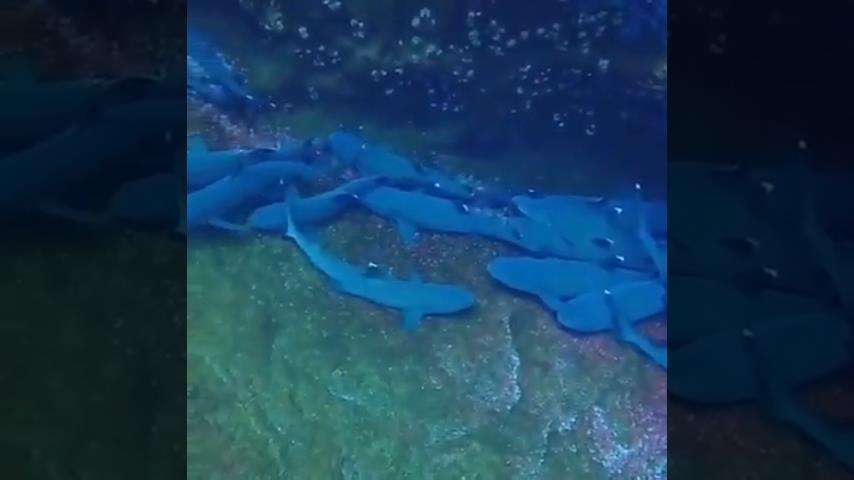 A diver approaches a herd of sharks, when suddenly appears in front of an odd fish.