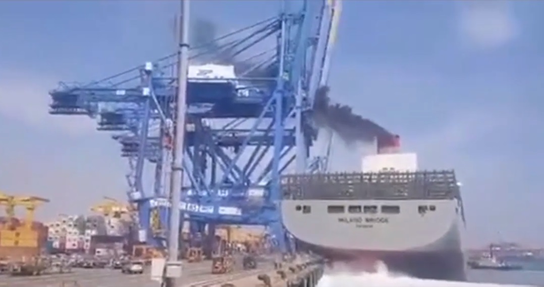 Monday 6 April 2020, Shopping Milano Bridge ship collided with a crane at the port terminal Busan, South Korea. The imposing structure collapsed onto the quay and the ship's stern. A worker is injured slightly.