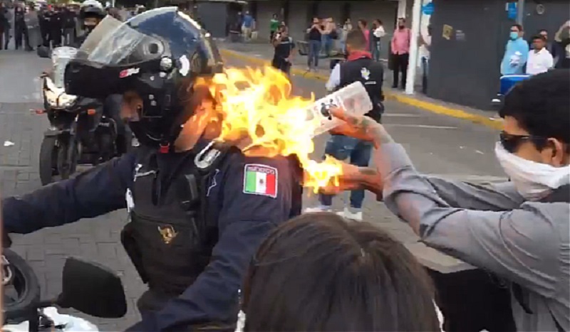 On the afternoon of Thursday, June 4, 2020, A protester set fire to a motorcyclist during a protest rally in Guantanamo, Mexico.. This demonstration started on the occasion of the death of a man, by Giovanni López, arrested on May 4 by Ixtlahuacán de los Membrillos in the city police for not wearing a mask. López died the next day while in custody.