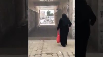 An elderly woman is trying to cross a tunnel, which is just a painting on a wall.