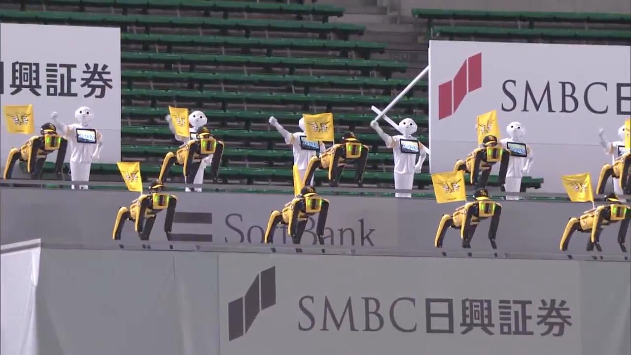 In Japan, the Spot robots (Boston Dynamics) and Pepper (Softbank Robotics) dancing in a tent set up in the stands at halftime of a baseball game between Fukuoka SoftBank Hawks and Rakuten Eagles.