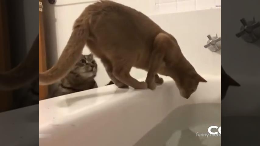 A cat pushes another cat from the edge of a bathtub and causes it to fall into the water. Long live the king!