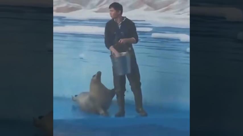 In a Zoo, a seal begs the caretaker to give her a fish, tapping his foot.