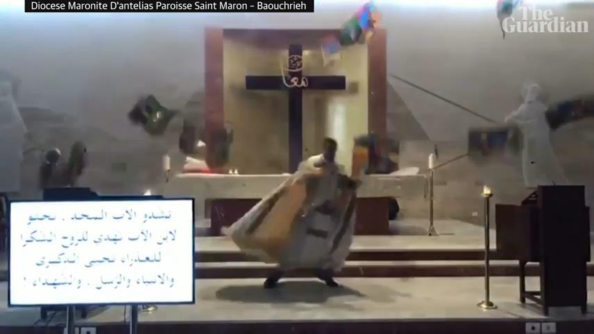 A priest performs a service inside a church in Beirut at the time of the explosion.