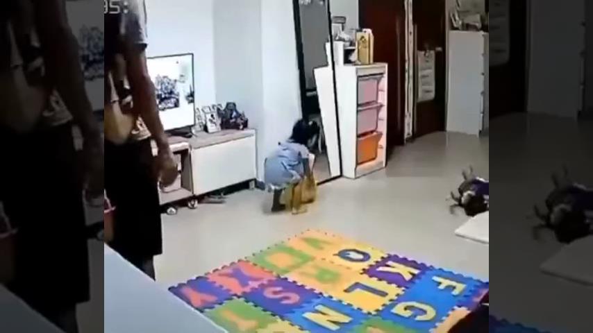 A father intervenes very quickly before a large mirror falls and hits his little daughter.