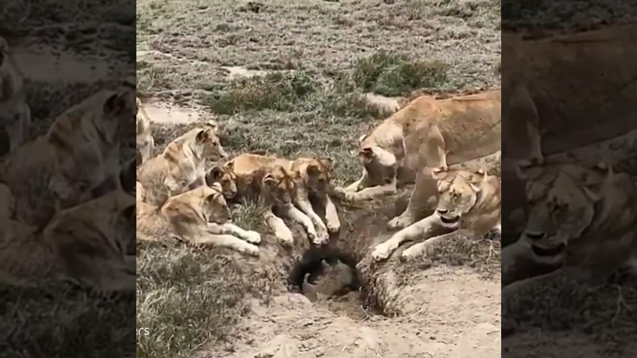 A lentil has entered a hole in the ground, as he is surrounded by 9 hungry lions.
