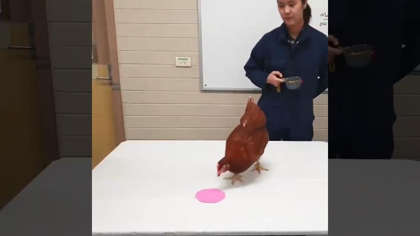 A chicken has learned to strike a certain color with its beak, to then be rewarded with some food.