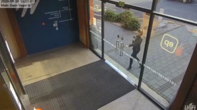 A woman opens a glass door during a storm in Dunedin, New Zealand.