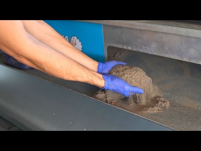 In a carpet cleaner in Poland, a machine thoroughly dusts a large carpet. Then we see the amount of dust and dirt that hid the carpet inside.