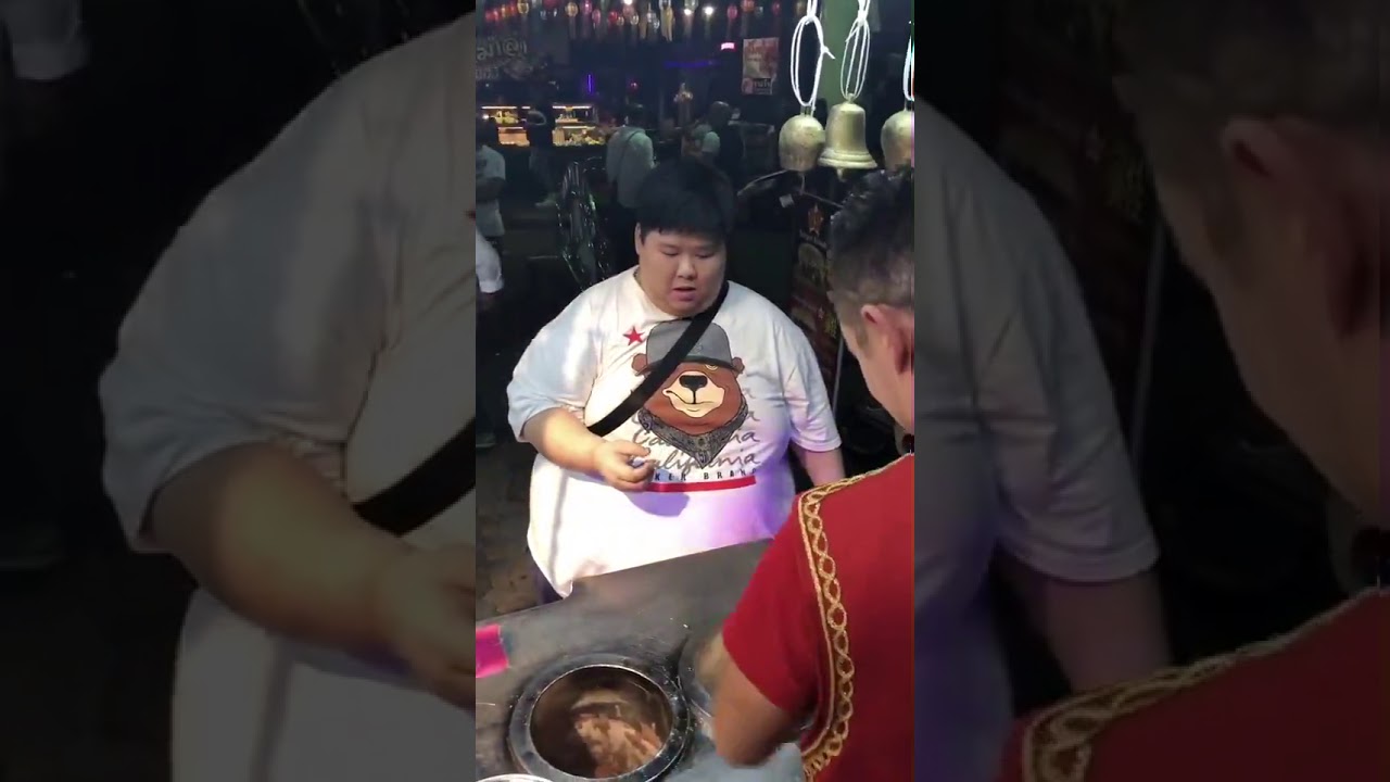 An ice cream maker does various funny tricks before giving the ice cream to a customer, who seems to have no fun at all with the show.