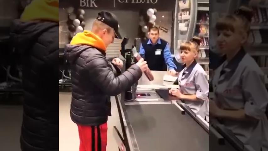 Two young men do a magic trick to steal a salami from a supermarket in Ukraine.