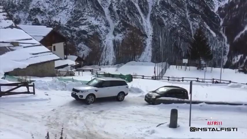 As the driver of a Land Rover tries to detach his car from a snowy uphill, a Fiat Panda passes by him without any problems.