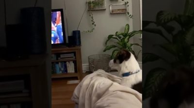 Rudy the dog gets confused, hearing his name repeated on TV.