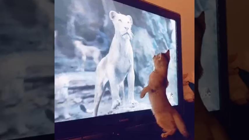 While watching the movie Lion King standing on two legs in front of the TV, a kitten was scared for a while when it saw a lion close up in front of the screen.