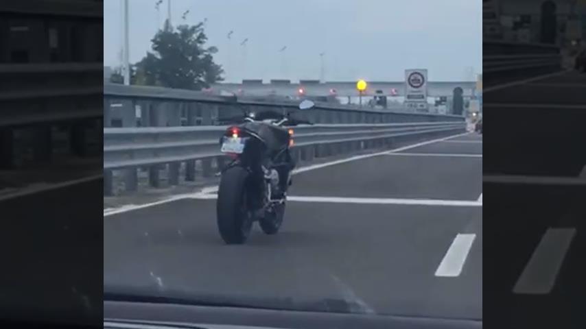 A motorcycle rides without a rider on a motorway in Italy. He finally decided to stop after hitting a guardrail, as he approached the toll booths. He probably had no money to pay.