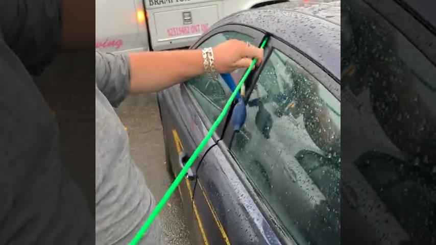 A roadside assistant in Canada opens a locked car door with some special tools and a little mastery.