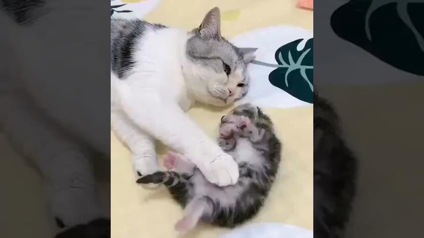 Seeing her little one be anxious, a cat mom tries to calm him down.