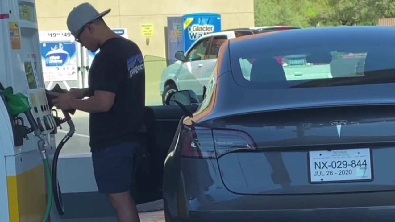 A young man arrives at a gas station in a Tesla electric car, and tries to put gasoline.