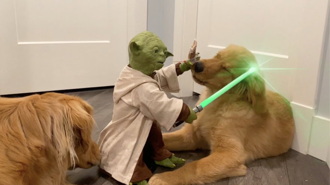 A Master Yoda doll with a lightsaber trains two Golden Retriever dogs to become Jedi.