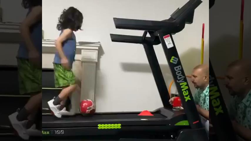 A father trains his son in dribbles, on a treadmill. The exercise will end in a bit of precision.