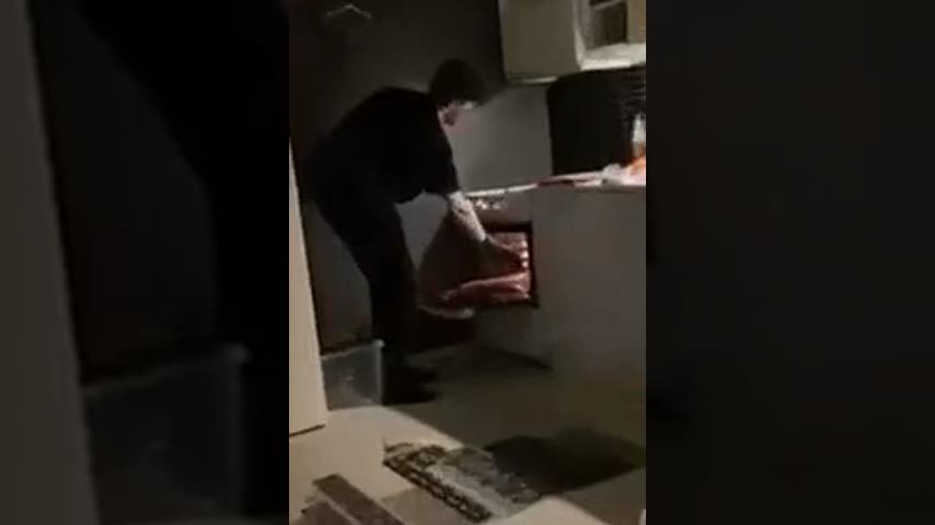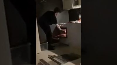 A man tries to take the pizza he just baked out of the oven. Flop.