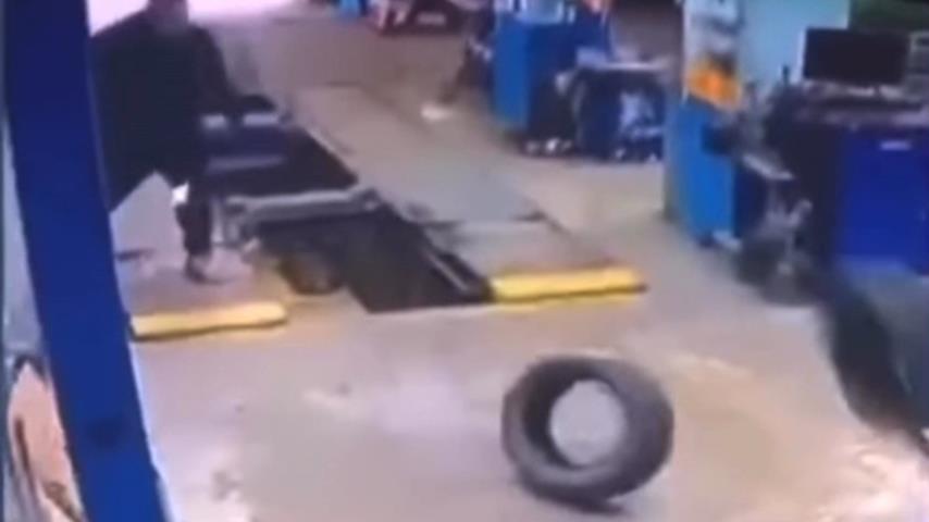 An mechanic impressively catches two car tires rolling out of control in his workshop.