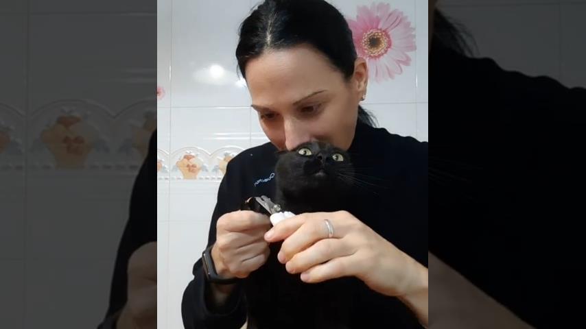 The owner of a cat shows a way in which she can easily hold her cat in repression until she cuts her nails.