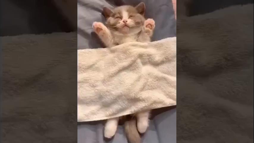 On a bed, a kitten cuddling accepts and enjoys it. It turns in all directions so that it...
