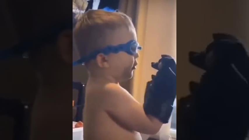 A little boy imitates a superhero wearing gloves and goggles. He will start with his super speed to face the bad guys, but will have a small accident.