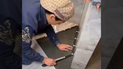 Worker uses an unusual tool to accurately cut a tile.